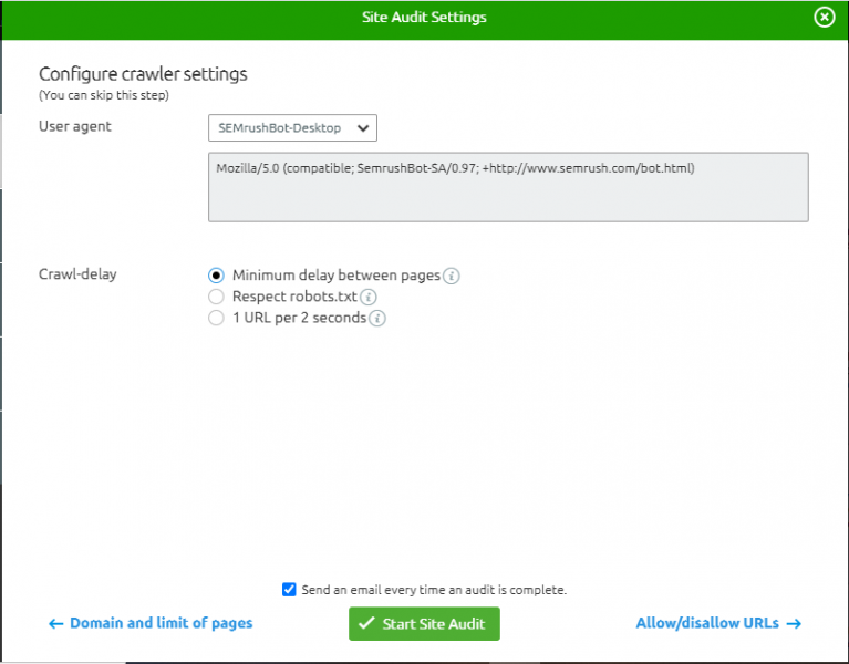 This is where the projects get interesting. SEMrush has a host of automated audits that you can add to your project and, while no software is ever going to completely replace thorough examination by an experienced professional, these do offer a fantastic starting point. The first we’re going to look at is the overall site audit.