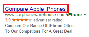 Essentially, a PPC ad is the search marketing equivalent of an ‘elevator pitch’, it has to have punch, convince and convert in a tiny space, and that’s where feel that advice comes in handy. Picking one of the screen captured ads from the previous image, we’ll go through each step. The following was chosen as, following a search for ‘iPhone’, I feel the ad caters well to what represents an ‘awareness’ level search.